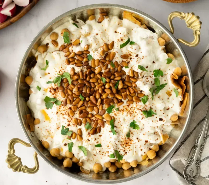 Mansaf consists of tender lamb cooked in jameed (fermented dried yogurt), served over rice, and topped with toasted almonds or pine nuts. It is typically eaten with the right hand, following Bedouin customs, as a sign of respect and unity. The combination of savory lamb, tangy yogurt sauce, and fragrant rice makes this dish a must-try.